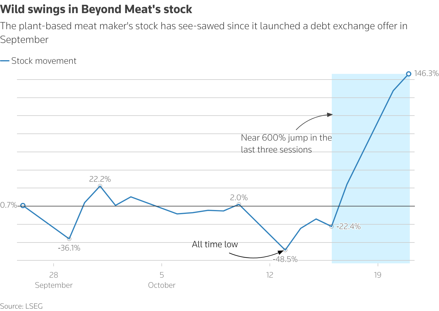 Oct 23 (Reuters) - Once a Wall Street darling worth roughly $14 billion, Beyond Meat BYND.O is now a meme stock.
