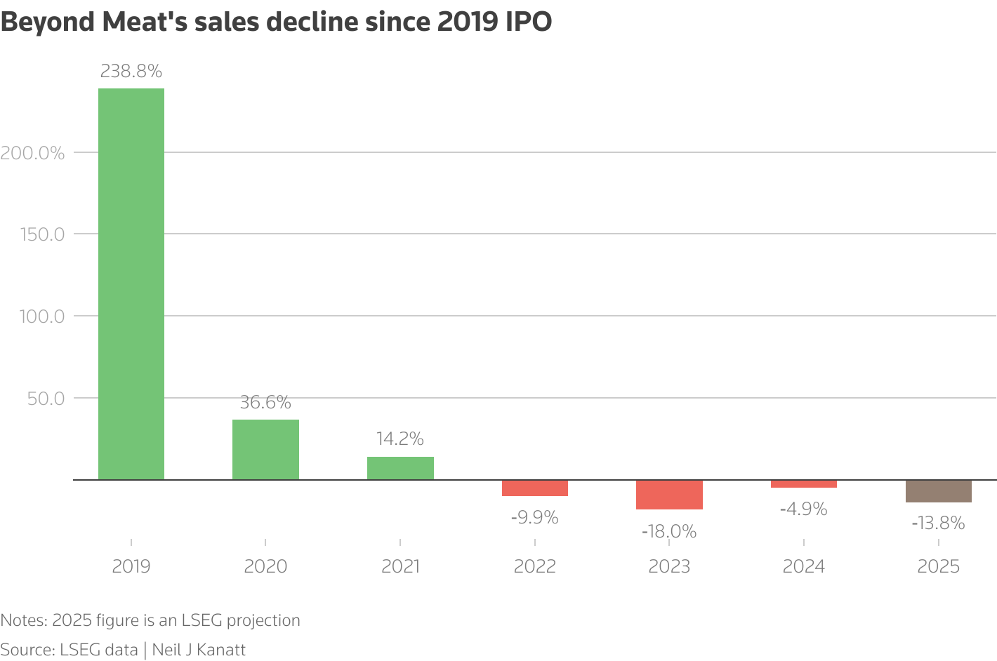 After years of phenomenal growth, Beyond Meat has recorded declining annual sales since 2022. It has never turned an annual profit.