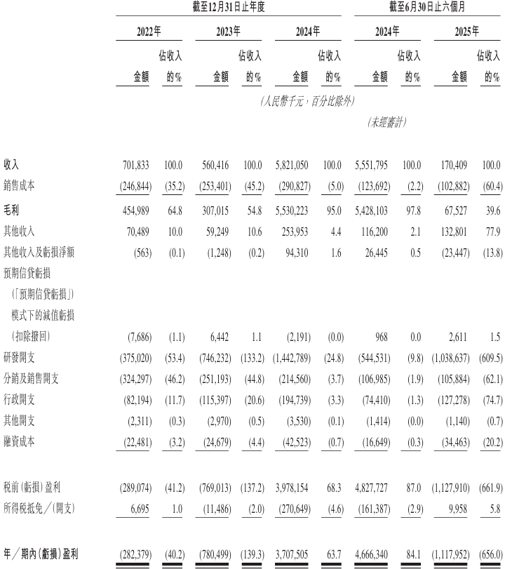 财务方面,于2022年、2023年、2024年及2025年截至6月30日止六个月,该公司收入分别约为7.02亿元、5.60亿元、58.21亿元、1.70亿元人民币;同期,年╱期内盈利分别约为-2.82亿元、-7.80亿元、37.08亿元、-11.18亿元人民币。