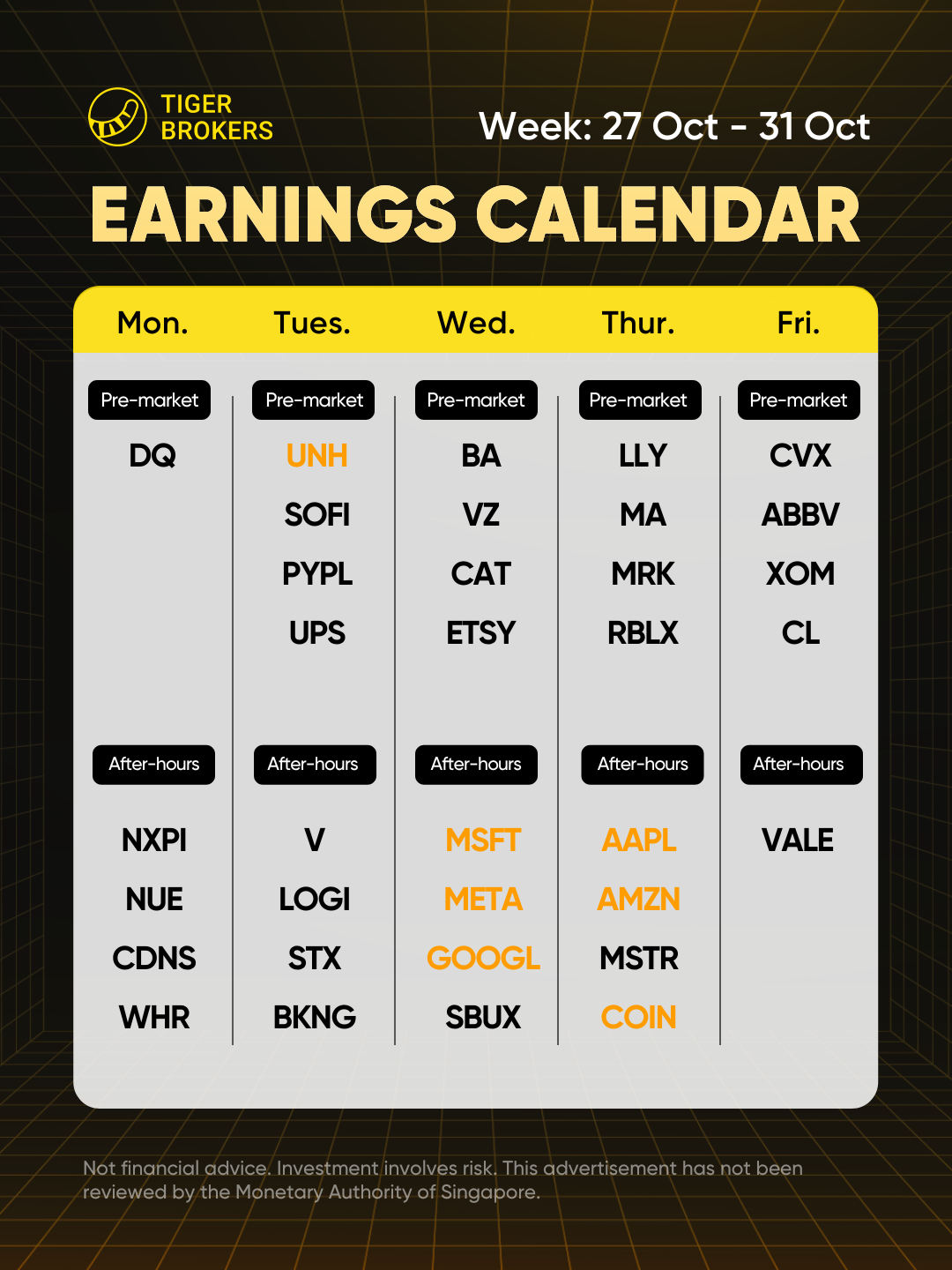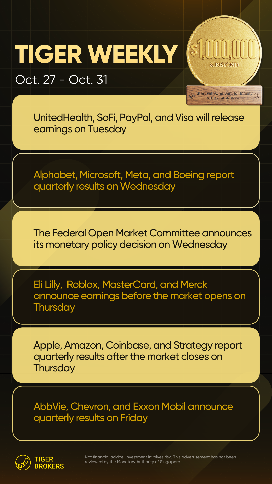 UnitedHealth Group and Visa announce results on Tuesday, followed by Alphabet, Meta Platforms, and Microsoft on Wednesday. Amazon.com, Apple, Eli Lilly, and Mastercard will release earnings on Thursday, and oil giants Chevron and Exxon Mobil will close out the week on Friday.