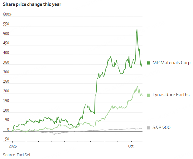 Retail and private investors are pouring in billions of dollars of their own. MP Materials, America's flagship rare-earth miner, has seen its share price roughly quadruple this year, raising its market capitalization to around $12 billion. Australian rare-earth company Lynas Rare Earths raised about $500 million from investors in August. Its share price has tripled this year.
