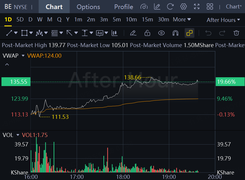 Bloom Energy's top line surged on electricity demand stemming from the boom in artificial intelligence. Shares rose 19.66% to $135.55 in after-hours trading.