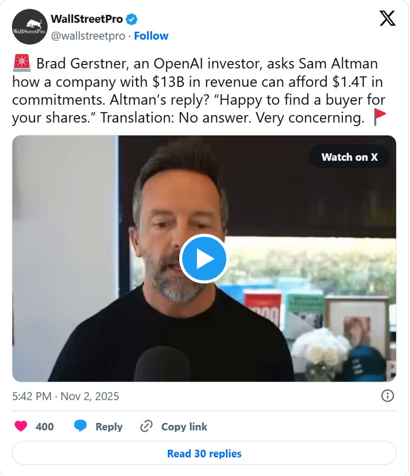 “Hanging over the market is — how can a company with $13 billion in revenue make $1.4 trillion in spending commitments,” asked Gerstner in an interview released over the weekend.