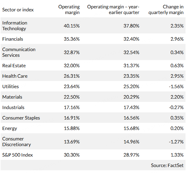 In this table, the sectors are ranked by operating margin for the most recent quarter, with comparisons to the year-earlier quarter. Operating margins for the full index are at the bottom: