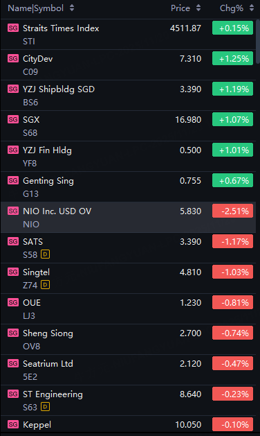 STI up 0.2%; Yangzijiang Shipbuilding, SGX up 1%; Nio fell 3%; SATS, Singtel fell 1%.