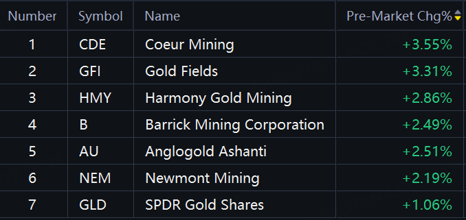 U.S.-listed shares of gold miners rose premarket. Coeur Mining, Gold Fields, Harmony Gold up around 3%; Barrick Mining, Anglogold, Newmont Mining up over 2%.
