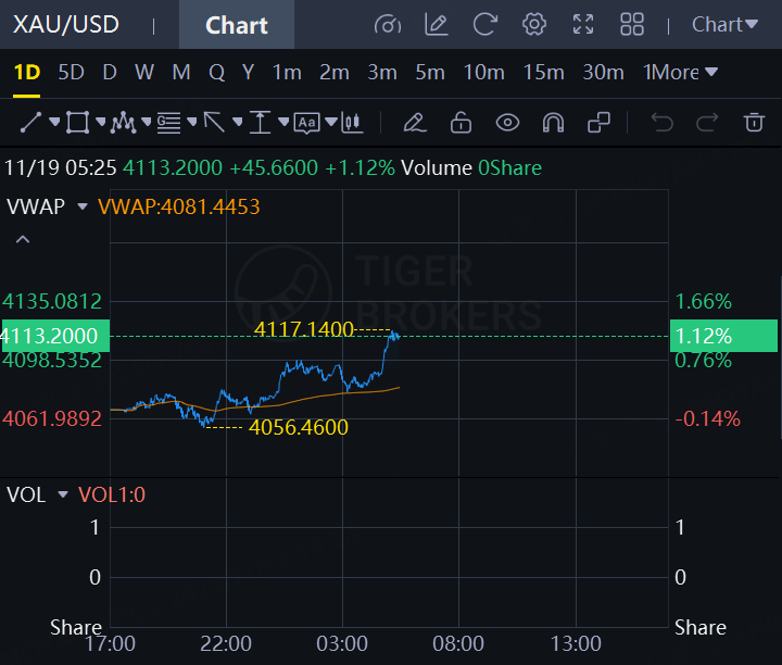 Spot gold up 1.12% at $4,113.2/ounce as investors seek safe-haven assets, with focus on the Federal Reserve's latest meeting minutes and a delayed U.S. jobs report for signals on future rate moves.