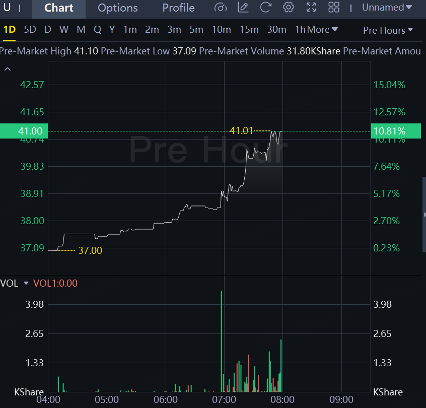 Unity Software shares were up 11% in recent premarket activity.