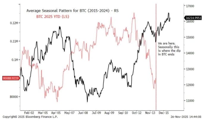 According to Krinsky’s chart, bitcoin is just about to come out of a traditionally weak period, based on a 2015 to 2024 historical pattern. “The average seasonal pattern for BTC bottoms Nov. 26th and has a strong tailwind into year-end,” he said