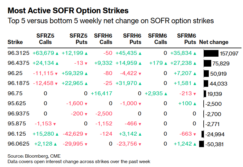 最活跃SOFR期权执行价——SOFR期权执行价按最近一周净变动分列前五名与后五名