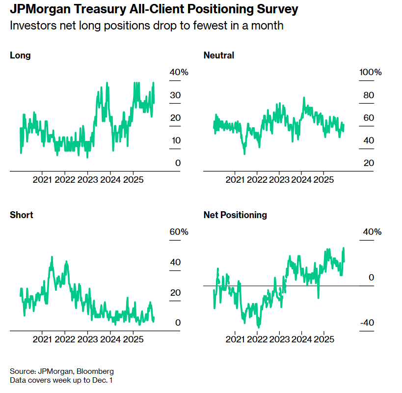 下图为摩根大通进行的全客户美债仓位调查,显示出投资者们净多头仓位降至一个月以来最低水平。