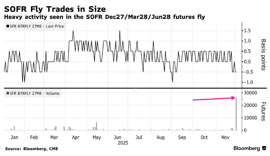 在杠杆期货市场中,交易员们已经在为各种情景预先布局。周一,一位巨量买家出现在某个SOFR期货“飞跨”(futures fly)结构中,这是一年多以来在该特定结构中出现的最大宗交易。近期几个交易日,3个月、6个月和12个月SOFR价差的交易也十分活跃,凸显出交易员们正试图押注在2026年将进行的更大规模的降息政策。