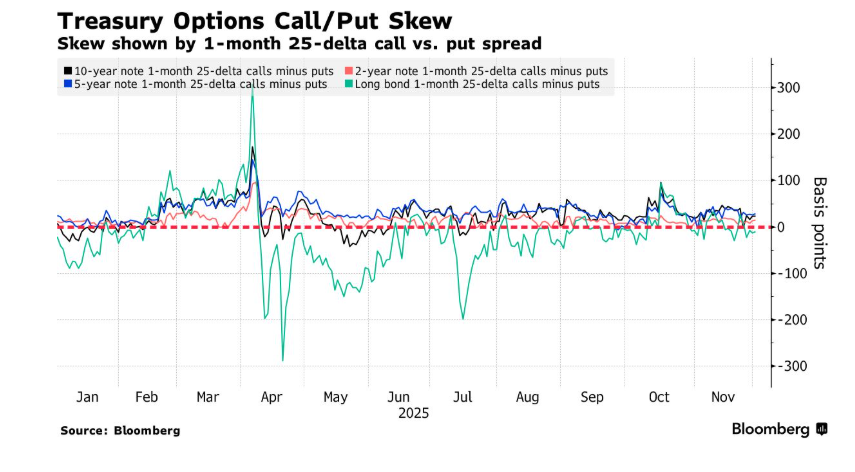 过去一周,用于对冲美债的期权所支付的权利金总体仍在中性水平附近徘徊。在期货序列的前端与中端区域,权利金略微偏向看涨期权,高于看跌期权,这表明交易员们更愿意支付溢价来对冲前端与曲线“腹部”美债价格上涨(即收益率下行)的风险,而不是对冲价格下跌(收益率上行)的风险。