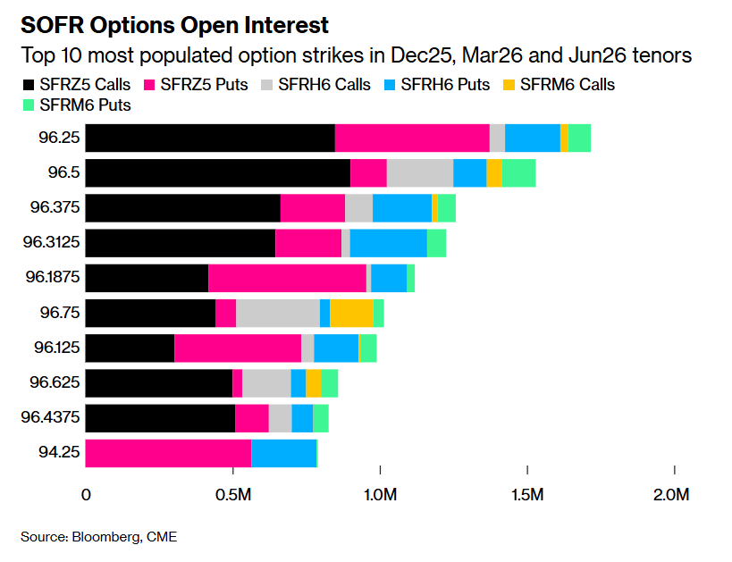 在所有期限延伸至2026年6月合约的SOFR期权中,96.25执行价仍然是持仓量最大的一个,原因是对涉及该水平的12月2025(Dec25)上涨看涨结构的需求持续旺盛。在12月2025 96.50和12月2025 96.375看涨期权上,也存在大量未平仓合约。对于大型看跌结构而言,12月2025 96.25和12月2025 96.1875执行价的看跌期权持仓则非常集中。
