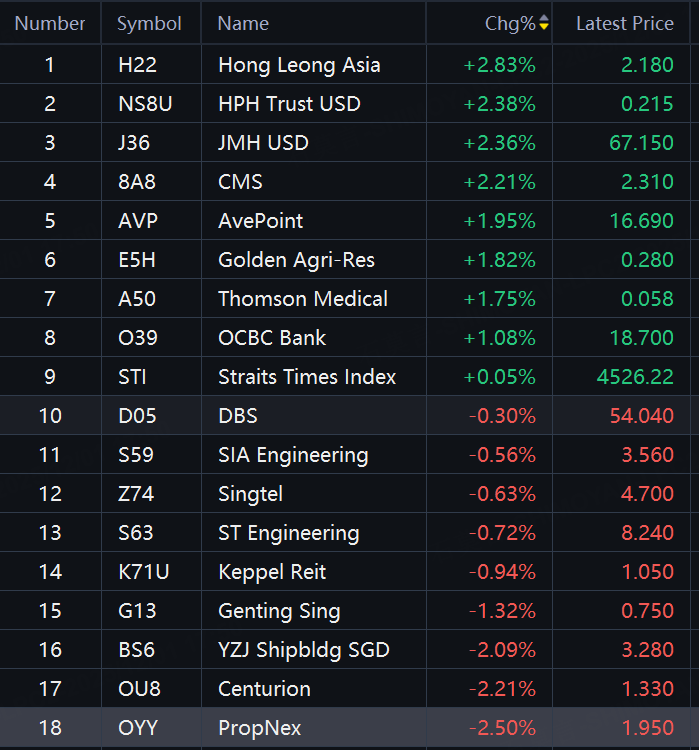 Hong Leong Asia up nearly 3%; HPH Trust USD, JMH USD, CMS, AvePoint up over 2%; Golden Agri-Res, Thomson Medical up nearly 2%; Genting Sing down over 1%; YZJ Shipbldg, Centurion, PropNex down over 2%.