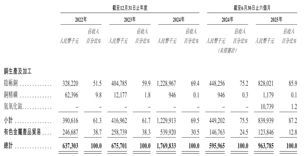 金浔资源2025年上半年来自阴极铜收入为8.58亿元,占比为85.9%;来着有色金属产品贸易收入为1.24亿元,占比为12.8%。