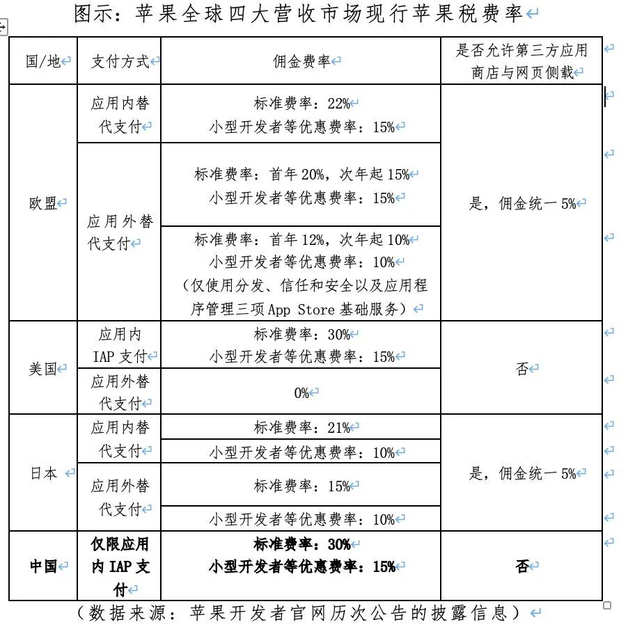 欧盟、美国、日本这三大市场均认为苹果税是一种垄断租金,也都通过立法、诉讼、执法等手段予以干预。由于各国监管尺度上的差异,费率水平参差不齐,就像应用外替代支付场景,美国开发者获得苹果App Store加急审核、应用分发等全部商店服务后的标准费率为0%,欧盟的相应标准费率为20%,日本则是15%。