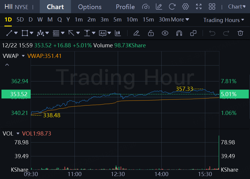 HII’s stock finished 5% higher on Monday, with a new closing high above $350. It’s up around 87% in the year to date. Shares were up 4% after hours.