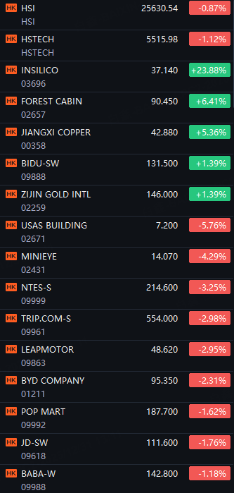 The Hang Seng Index ended Wednesday's half-day holiday session 224.06 points, or 0.9% lower, at 25,630.54, while the Hang Seng Tech Index fell 62.4 points, or 1.1%, to finish at 5515.98.