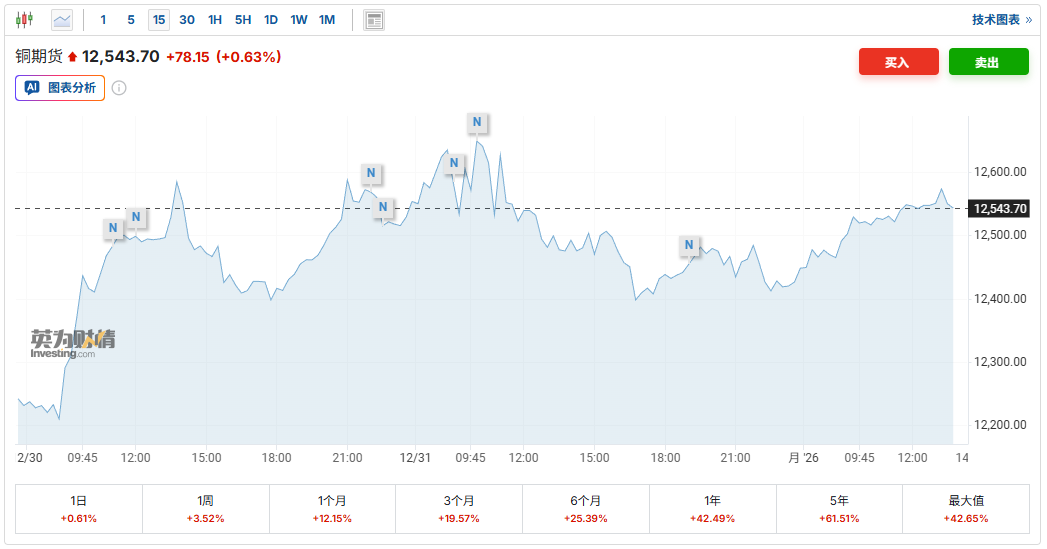 智通财经APP获悉,在市场供应将趋紧的前景下,铜价在2026年的第一个交易日恢复上涨。截至发稿,LME铜期货涨0.63%,报12543.70美元/吨。在过去的2025年,贸易错位、地缘政治不确定性和供应冲击共推动铜价大幅上涨。LME铜价在2025年累计上涨42%,创下2009年以来最大的年度涨幅,在去年年末的一波强劲上涨中接连刷新历史新高。