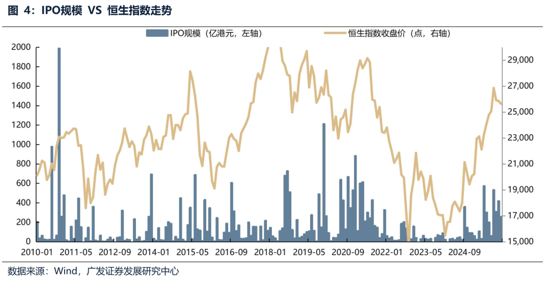 拉长时间看,IPO规模高峰、募资高峰(算入上市后募资,即配售+供股+代价发行)并不会扭转港股的趋势,更不会引发港股市场的下跌。典型的例如2010年、2014-2015年、2017年、2020年、2025年港股的募资高峰都对应的港股的牛市,背后可能是由于港股市场出现明显好转,部分企业有扩张需求,选择相对高点在资本市场募资。