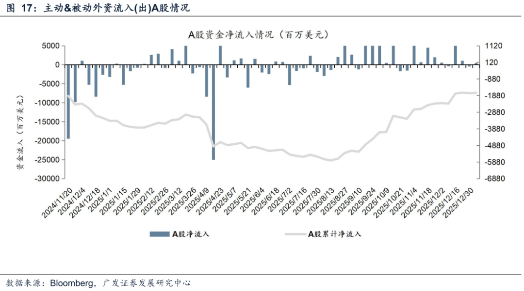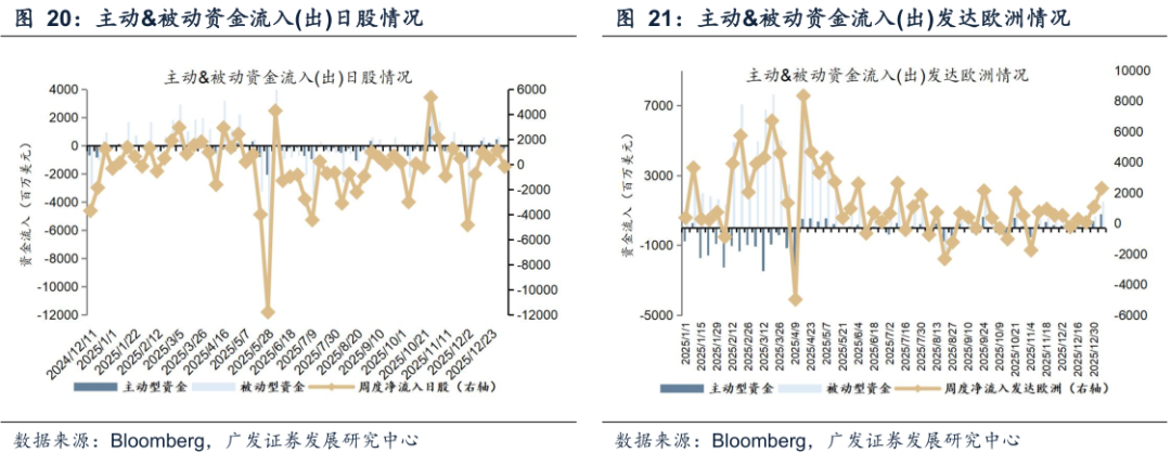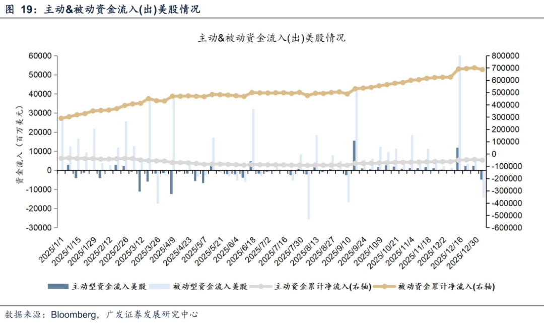 美股主被动资金转流出。截至本周三(12月31日—1月7日),美股主动资金流出47.89亿美元,上周流入23.31亿美元;被动资金流出14.17亿美元,上周流入64.32亿美元收敛。