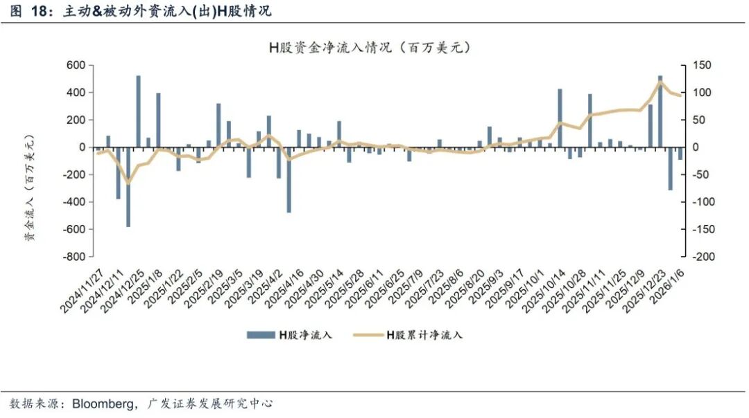 A资金转流入、H资金流出收敛。截至本周三(12月31日—1月7日),A股外资流入0.87亿美元,上周流出1.3亿美元;H股外资净流出0.23亿美元,相较上周流出0.79亿美元收敛。