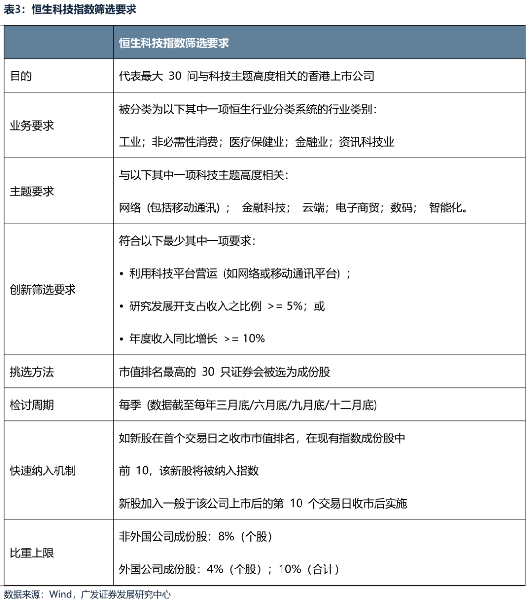 恒生科技指数的编制规则旨在选取30家最具代表性的香港上市科技公司,其筛选首先要求公司属于工业、非必需性消费、医疗保健、金融或资讯科技行业,并且业务须与网络、金融科技、云端、电子商务、数码或智能化等科技主题高度相关;同时,公司必须满足至少一项创新标准,包括利用科技平台运营、研发开支占收入不低于5%,或年度收入增长不低于10%。合资格证券按市值排名,最高的30只被选为成份股,并实行季度检讨。此外,规则设有快速纳入机制,允许上市初期市值排名前列的新股快速进入指数,并对成份股设有个股权重上限(非外国公司8%,外国公司4%)。