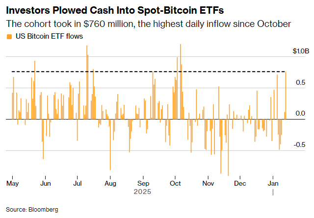 加密货币投资者正以一贯的姿态开启新年:大举涌入比特币ETF。统计数据显示,本周二,持有比特币的十余只ETF共录得约7.6亿美元资金流入,创去年10月以来最大单日净流入。其中,比特币ETF-Fidelity(FBTC.US)贡献了主要部分,单日吸金3.51亿美元。