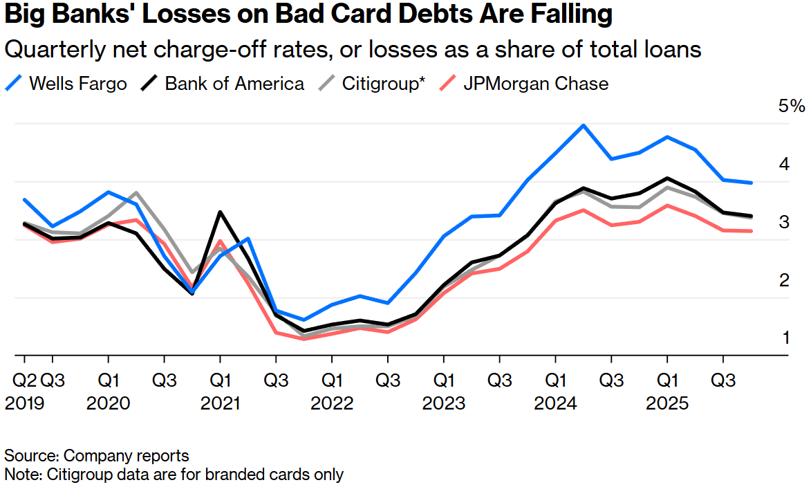 但这并没有转化为大型银行的实质性阵痛。对于这些大银行来说,信用卡的逾期率并未恶化,而 2025 年这些贷款机构的实际坏账损失占总余额的比例反而有所下降。即使是在第一资本金融和同步金融等尚未公布第四季度数据的专门信用卡公司,预计其净坏账核销率也仅会微幅上升,且仍将显著低于 2024 年底的水平。