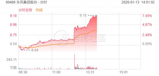 1月13日,东风集团股份午后拉升,现涨超7%,报9.15港元,成交额超3亿港元。