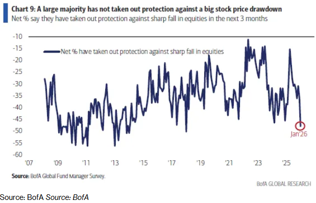 智通财经APP注意到,本周股市的突然回调可能会让许多投资者措手不及。根据美国银行在周末格陵兰岛局势升级前进行的一项调查显示,基金经理的情绪达到了2021年7月以来的最高看涨点,而防范股市回调的保护性头寸则暴跌至八年来的低点。