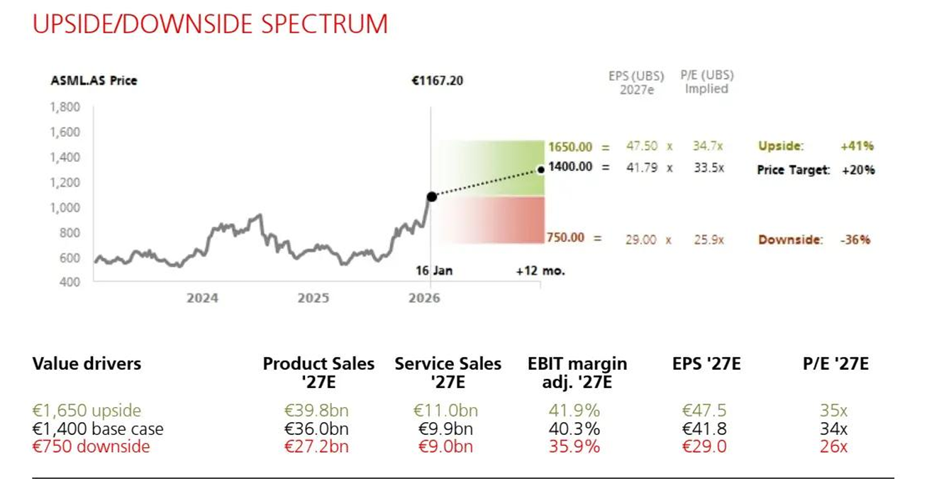 瑞银将阿斯麦的2026年营收增长预期从此前的增长14%大幅上调至23%,2027年增长预期则从9%上调至14%。瑞银预计阿斯麦即将披露的2025年第四季度总营收约为97.47亿欧元(符合公司指引的95亿欧元中值区间),预计2026年总体营收强劲增长23%至401.49亿欧元,预计2027年增长14%至458.89亿欧元。阿斯麦EPS(每股收益)预期方面,瑞银预计2026年该利润指标有望高达33.83欧元(较市场一致预期高出足足26%),2027年达41.79欧元(较市场一致预期高出25%)。在最乐观的EPS预期之下(即2027年EPS 47.5欧元),瑞银预计阿斯麦股价有望达到1650欧元。