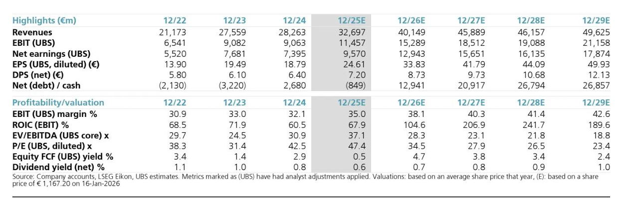 即使在经历股价大幅上涨之后,瑞银仍维持对于阿斯麦股票的“买入(Buy)”评级,并将12个月目标价上调至1400欧元(此前为1030欧元),最乐观牛市目标价更是高达1650欧元,且对于2026/27年营收与盈利预测显著上修。此外,瑞银认为阿斯麦2025年第四季度业绩(1月28日披露)以及未来光刻机订单/业绩指引大概率将超过市场预期,瑞银押注Q4光刻机订单在其模型判断下可能高至90亿欧元,远远高于上季度的54亿欧元,意味着中期的牛市动能足以支撑阿斯麦估值扩张空间。