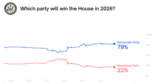 图表:截至今年1月24日,Polymarket数据显示民主党赢下众议院的概率达79%