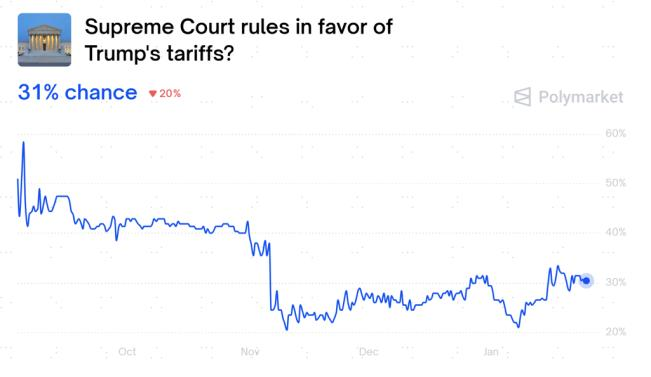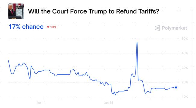 图表:截至今年1月24日,市场预期最高法院裁决特朗普退还关税收入的概率仅17%