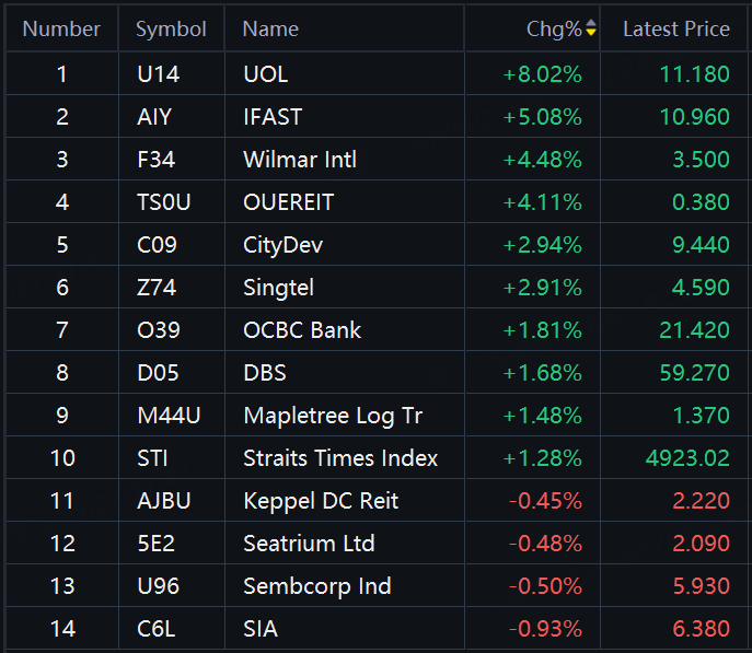 UOL up 8%; iFast up 5%; Wilmar Intl, OUEREIT up over 4%; CityDev, Singtel up about 3%; OCBC Bank, DBS up over 1%.
