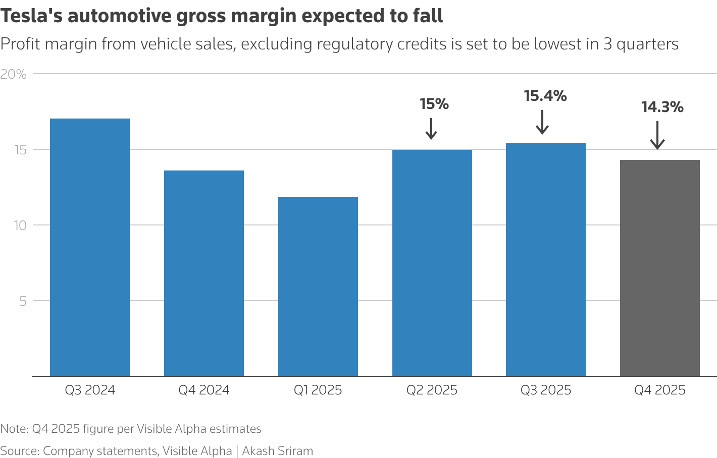 Automotive gross margin in the last quarter of 2025, excluding regulatory credits, of 14.3%, will likely be the lowest in three quarters, according to Visible Alpha estimates. Tesla's regulatory credit revenue also is dwindling.