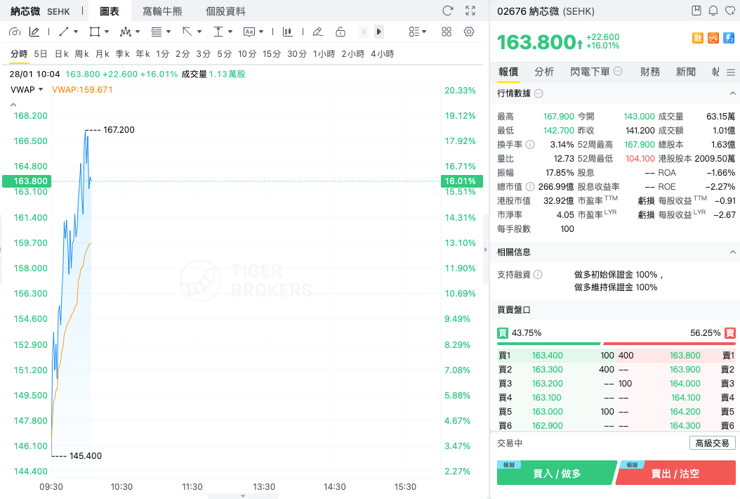 1月29日, 纳芯微 涨超16%,截至发稿,涨16.01%,报163.8港元,成交额1.01亿港元。