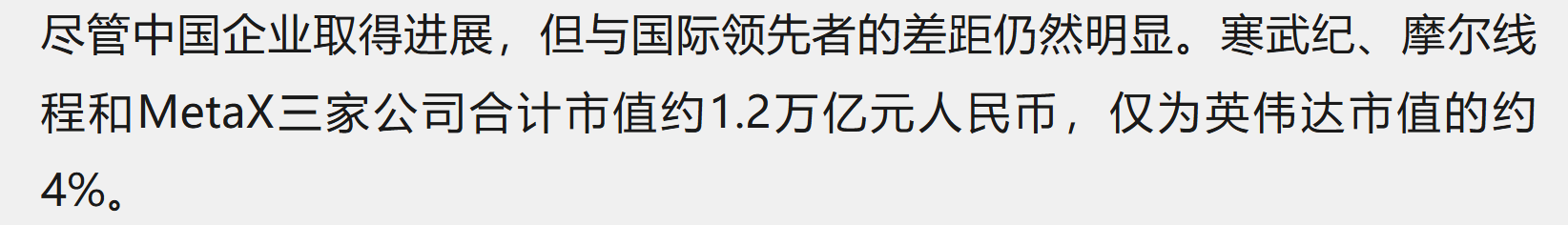 资本市场对国产AI芯片企业给予高度认可,寒武纪、摩尔线程和MetaX三家公司合计市值约1.2万亿元,尽管仅为英伟达市值的约4%,但已显示出市场对国产芯片未来潜力的乐观预期。