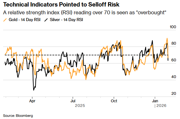 即便在此次回撤后,黄金在1月仍上涨约17%,逼近1980年以来最强劲的月度涨幅。白银的涨势更为惊人,今年以来已飙升43%。