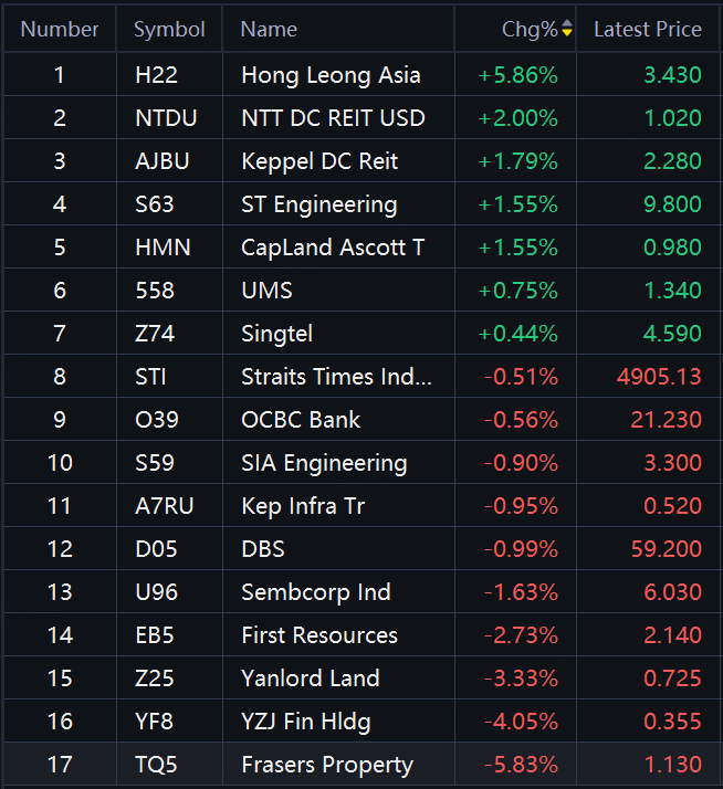 Hong Leong Asia up 5.9%; Keppel DC Reit, ST Engineering, CapLand Ascott T up over 1%.