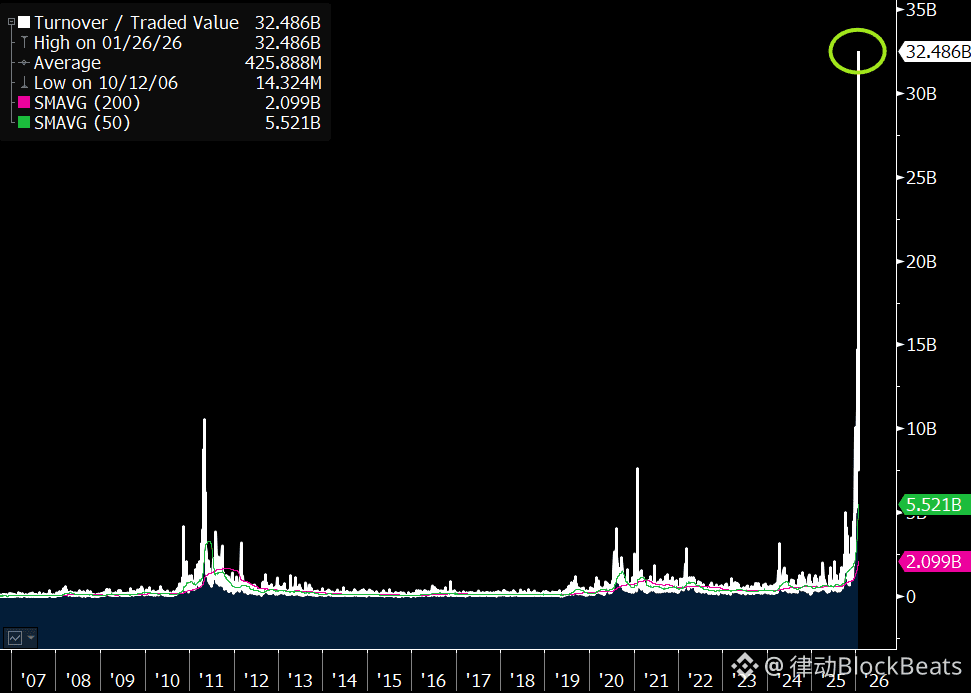 根据VandaTrack的数据,仅在1月份,个人投资者就向白银ETF净注入了创纪录的10亿美元。这种狂热在1月26日达到了顶峰——当天,白银ETF(SLV)的交易额达到了惊人的394亿美元,几乎逼近标普500指数ETF(SPY)的419亿美元。要知道,这只是一个单一金属的ETF,它的热度竟然快赶上美股大盘了。