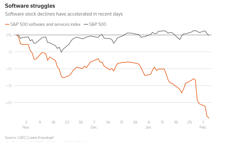 标普500软件与服务指数自10月底的近期高点以来已下跌约25%——同期标普500整体几乎没有变化。一部分交易员甚至对“逢低买入式抄底”这些受重创的软件股兴趣不大,一些期权交易员也选择观望。B Riley Wealth首席市场策略师Art Hogan表示:“这就是‘软件末日’(Software-mageddon)。”