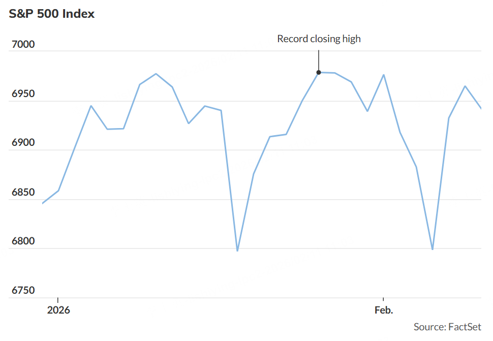 The index, which closed at a record high of 6,978.60 on Jan. 27, fell modestly Tuesday as investors weighed a U.S. retail-sales report that was weaker than Wall Street expected. While the S&P 500 was back in positive territory for the year, losses in its information-technology sector have made it a more challenging climb.