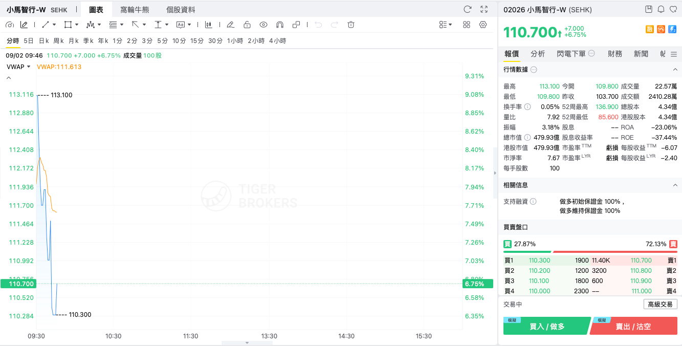 2月9日,小马智行-W升逾6%,截至发稿,涨6.76%,报110.7港元,成交额2410万港元。