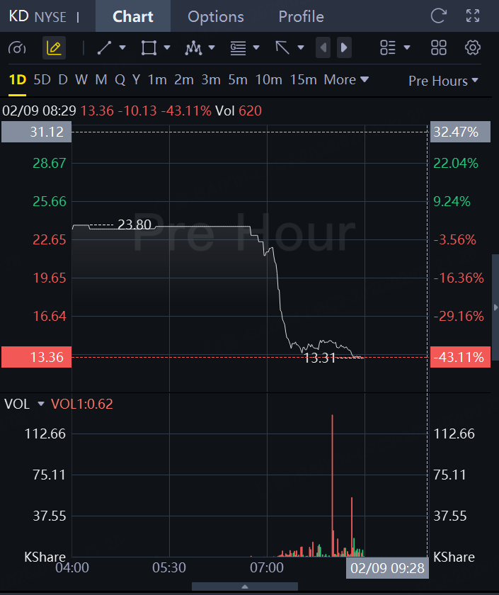 Technology services company Kyndryl's KD.N shares fall 43% to $13.36 premarket.