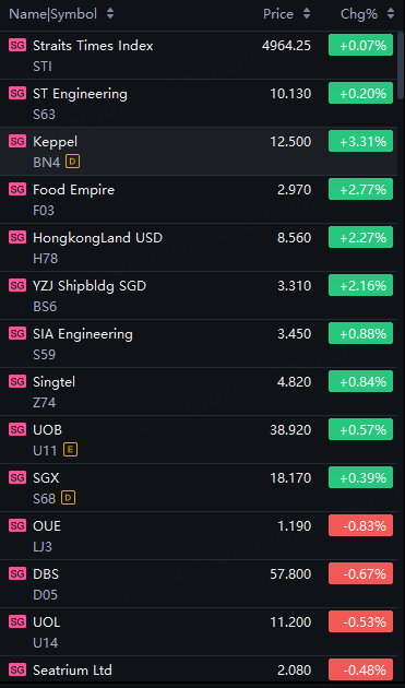 STI up 0.1%; Keppel up 3%; Yangzijiang Shipbuilding up 2%; SIA Engineering up 1%; OUE, DBS down 1%.