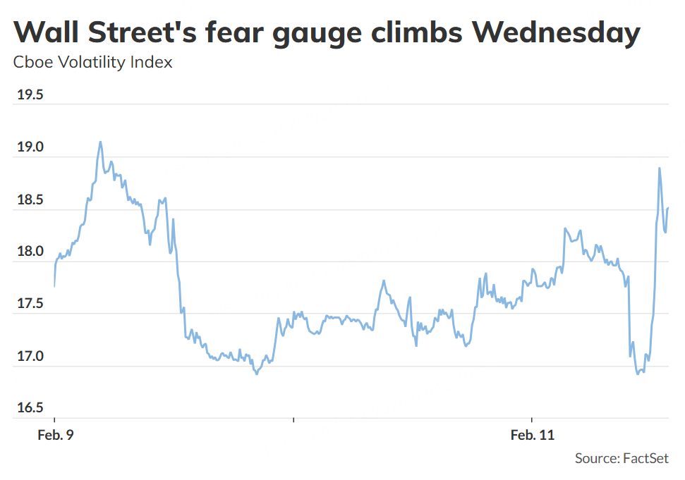 Wall Street’s “fear gauge” was active Wednesday, with the Cboe Volatility Index briefly jumping to as high as 18.9, according to FactSet, after starting the week around the 17 level.