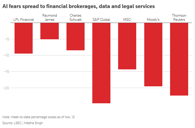 The financial industry, particularly brokerages and data analytics firms, were hammered after wealth management firm Altruist introduced AI-enabled tax planning features, stoking fears of the fast-advancing technology upending their business models.